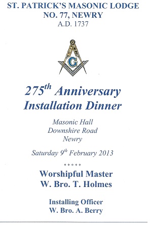 The Worshipful Master welcomed Rt. W. Bro Richard Gray, Provincial Grand Master of Down, to Lodge 77 and invited him to take the Chair to conduct the business of the meeting. Rt. W. Bro. Gray thanked the Worshipful Master and Brethren for his warm welcome but on this occasion declined the offer and returned the maul to the Worshipful Master. He was then saluted according to antient custom.