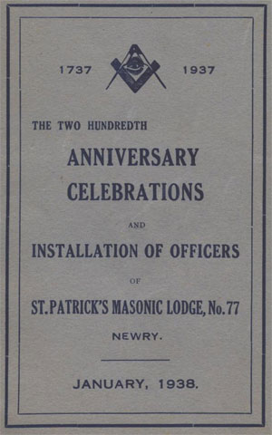 St. Patrick’s Masonic Lodge, 77, Newry, is the oldest Lodge in Ulster, having attained its two hundredth year in 1937. The Lodge still works under the Warrant it received in 1737.